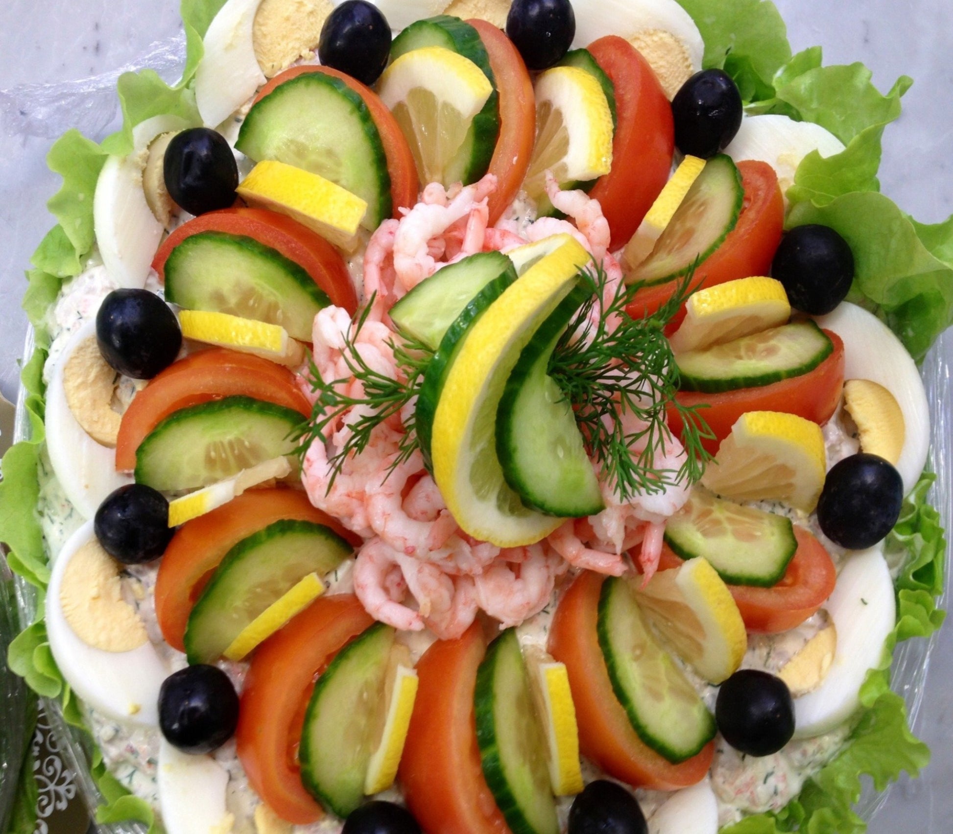 Läcker smörgåstårta som vi gör från grunden i vår kallskänk. Innehåller räkröra och tonfiskröra, med dekor av ägg, grönsaker och räkor.